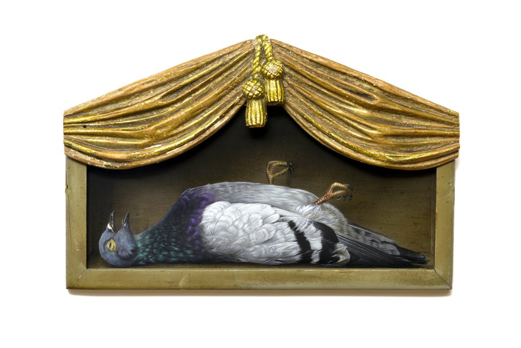 Dead Pigeon Posted 2025/12/17 by Turf One acrylic and spray on panel, antique frame and antique freemason ornament, 14.75×9.25” 2024