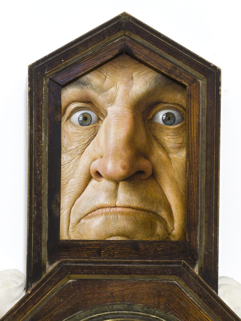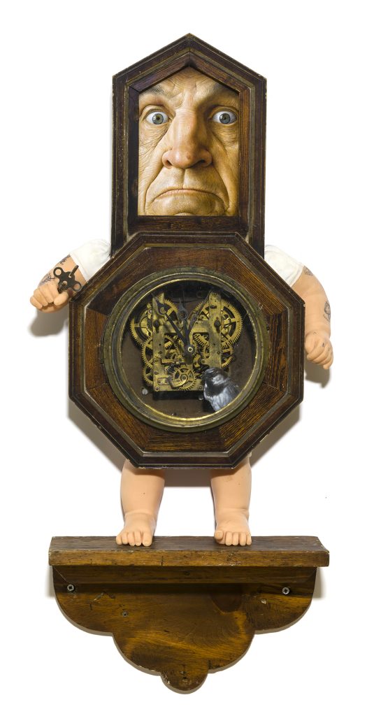 mixed media sculpture (acrylic and oil on panel, grandfather clock parts and doll parts), 28x21x4”