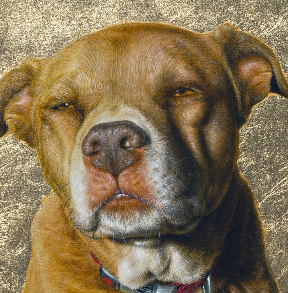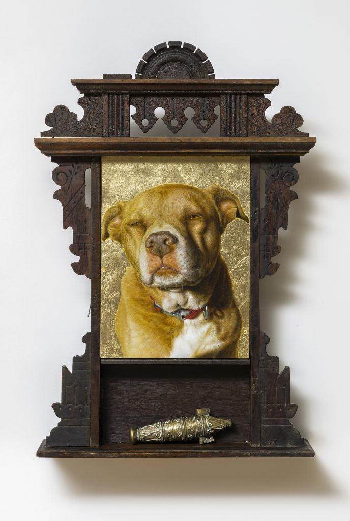 Tuna Posted 2025/12/26 by Turf One acrylic and gold leaf on panel, antique cabinet (customized to hold a vessel for ashes), 20.25×13.5” 2024