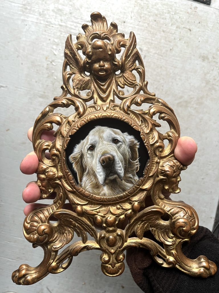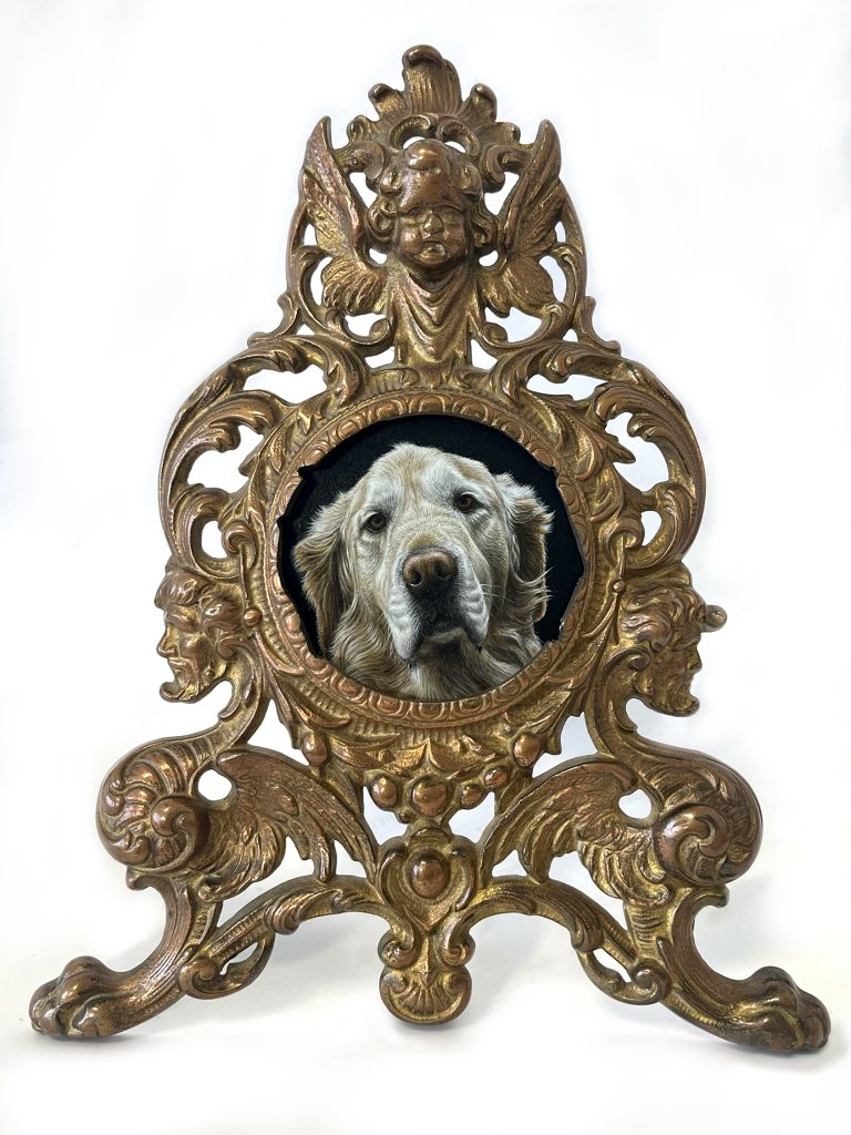 acrylic on panel, antique bronze clock frame, 8.5x10x2.5″