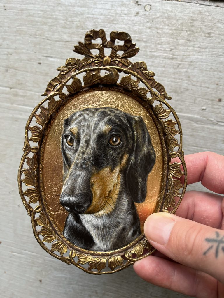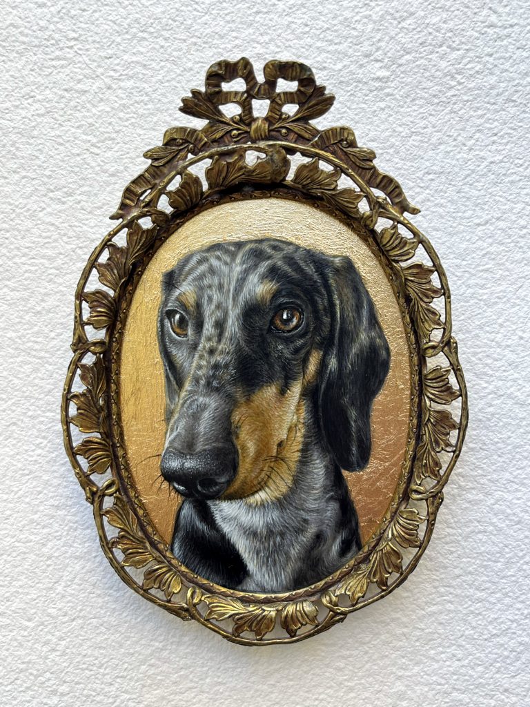 You-You Posted 2026/01/14 by Turf One acrylic and gold leaf on panel, antique brass frame, 5.75×4” 2025